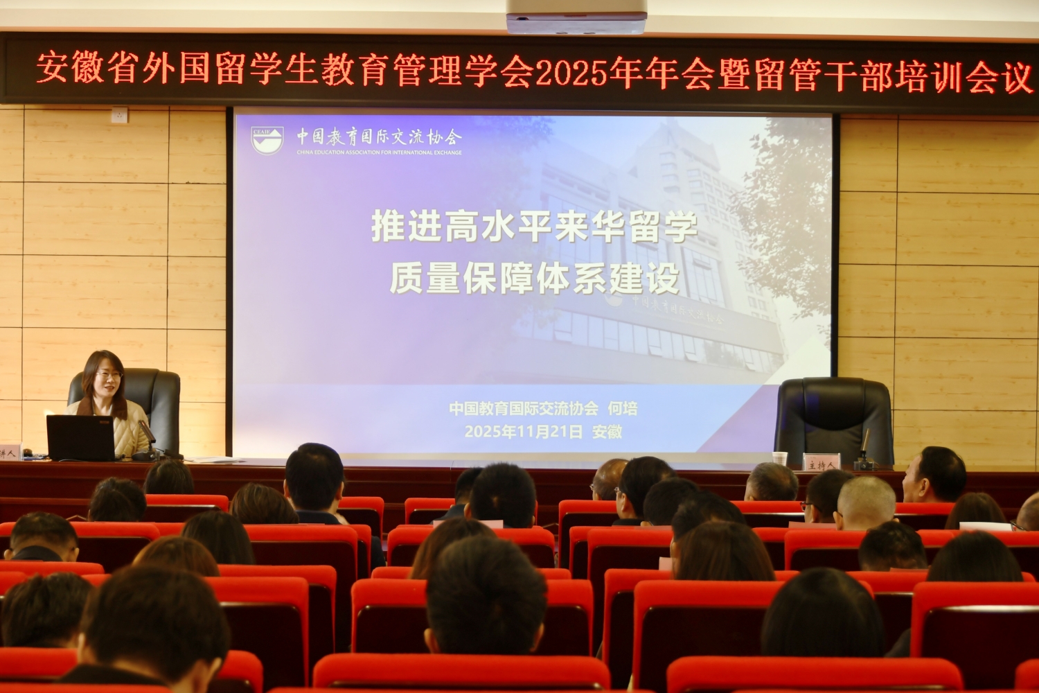 11月21日,安徽省外国留学生教育管理学会2025年年会暨留管干部培训会议在我校举行。会议特邀中国教育国际交流协会跨境教育质量保障部主任何培、南京大学海外教育学院程爱民教授等知名专家作专题报告,省教育厅外事处处长姚德勇出席会议,全省35所高校的一百余名留学生管理部门领导及留管人员参加会议。我校党委委员、副院长张小明出席开幕式并致辞。