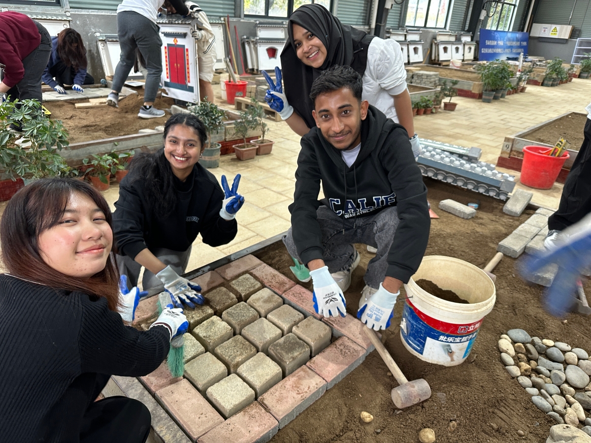 在基地导师指导下,留学生进行徽州园林微景观制作。他们分组协作、各司其职,测量、拼接、点缀等有条不紊。整个实操环节,大家专注投入,用双手将徽州建筑的精巧构思转化为实物作品,以行动诠释了不怕苦累的劳动精神。