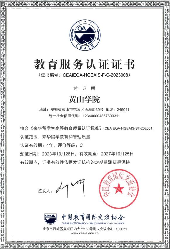 学校利用地域资源优势,着力打造“留学黄山”品牌,积极推动来华留学教育提质增效。2024年秋季入学后,留学生人数将突破130人,创历史新高,留学生规模在省内同类院校中位居榜首。学校坚持“生源定位精准化、研学活动技能化、文化课程实用化、专业教学国际化”办学特色,充分利用黄山国际旅游城市、皖南国际文化旅游示范区等平台,打造“徽州历史文化+黄山旅游+技能大赛”三位一体的“留学黄山”品牌。积极组织留学生参加文化体验和社会实践活动,增强知华友华爱华情感。2023年,学校高质量通过教育部来华留学生高等教育质量认证,获颁“教育服务认证证书”,来华留学教育工作被认证专家誉为“省内同类院校典范”。